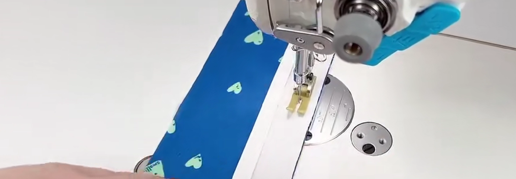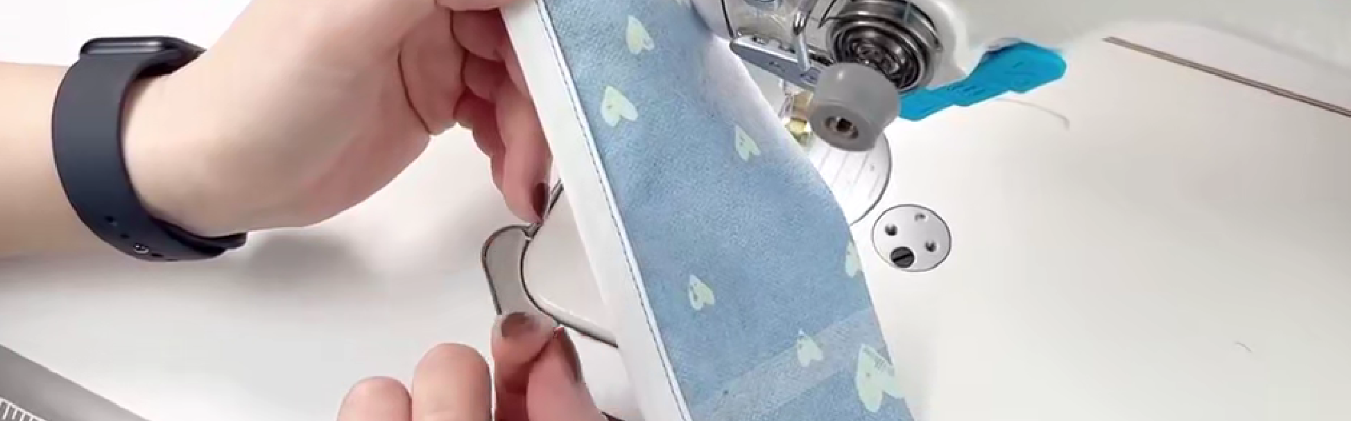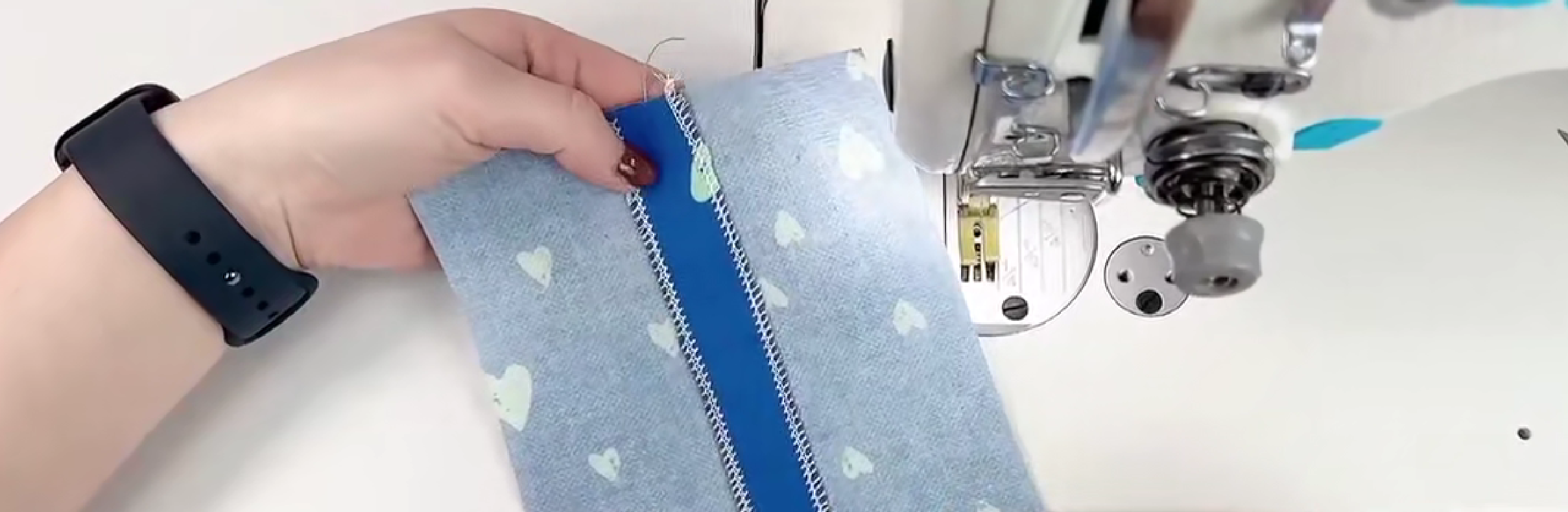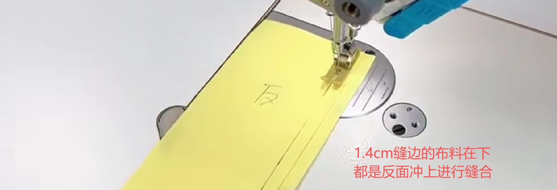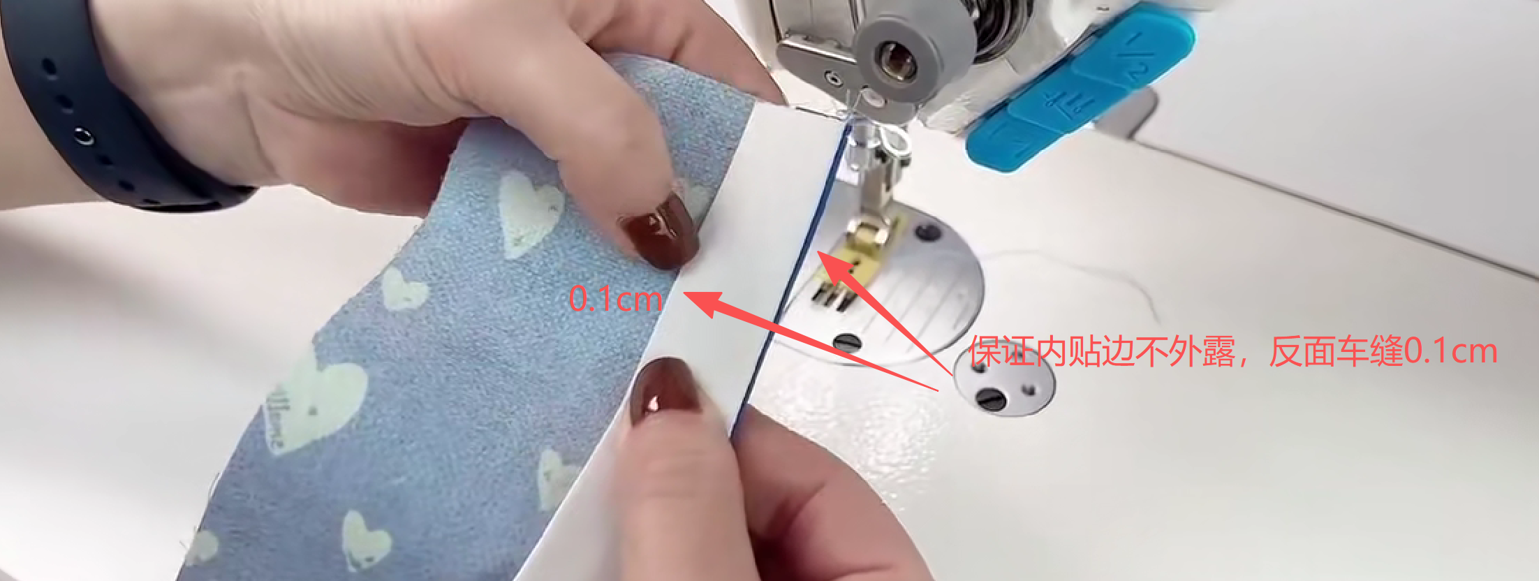 面料正面朝上,车缝0.1cm包边条,这样宽的一面的包边条就会有0.15-0.2cm宽的缝线,保证包边条缝合到布料上