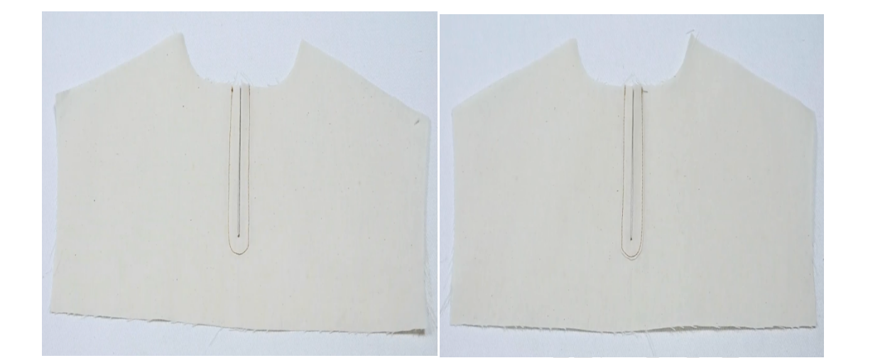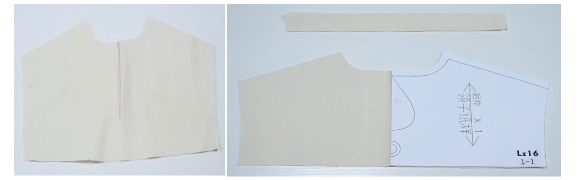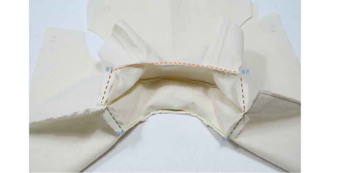 3、领面根据纸样对位点剪开1CM,两剪口间的缝份内扣烫平