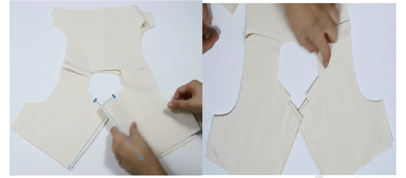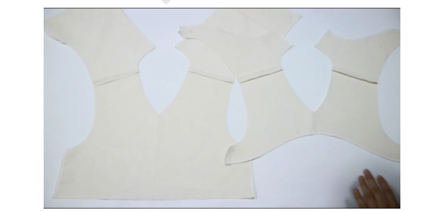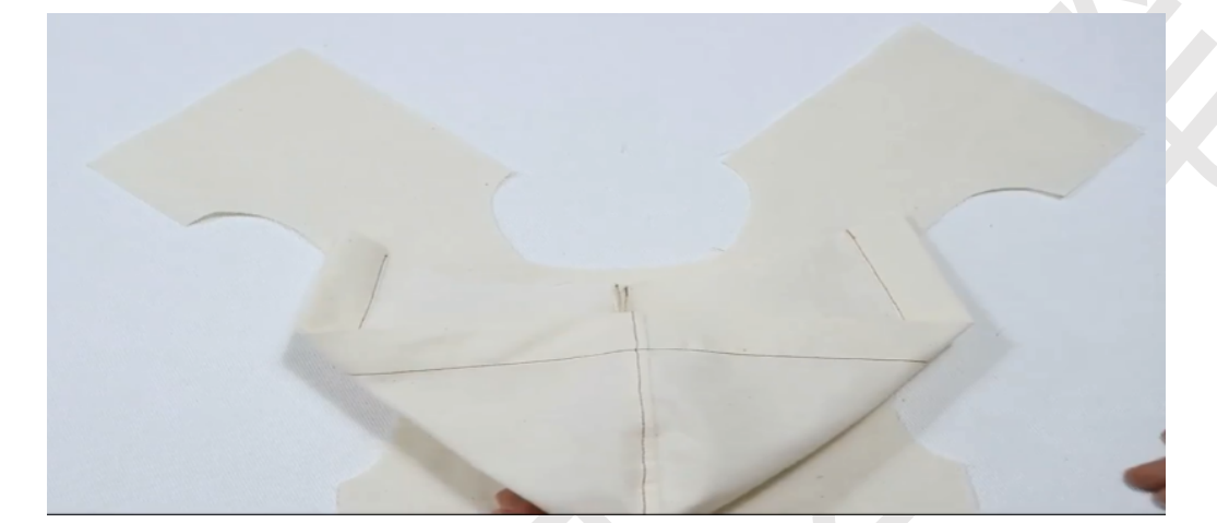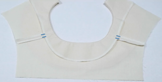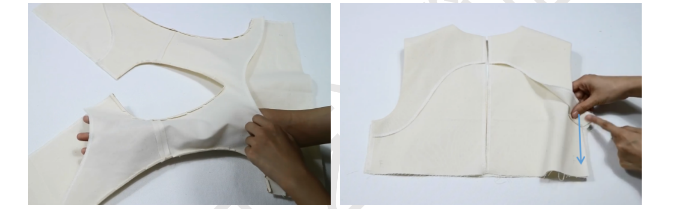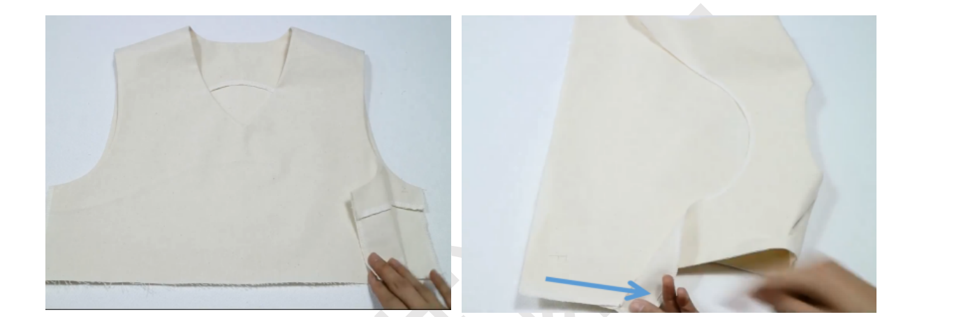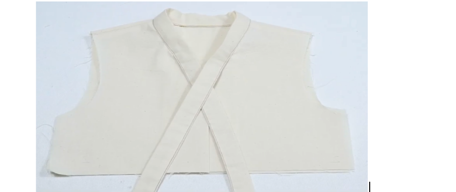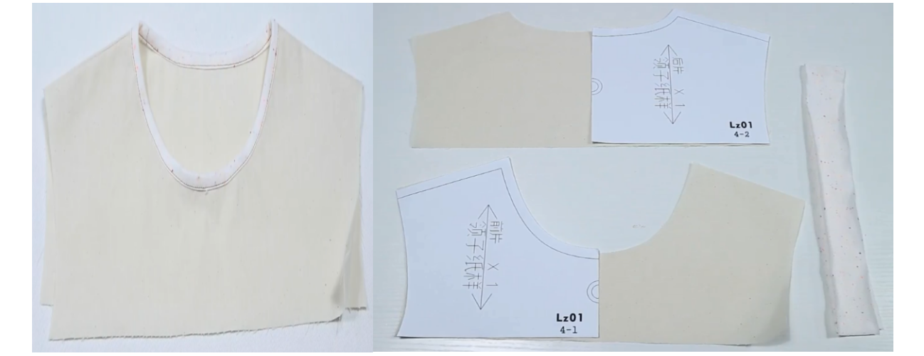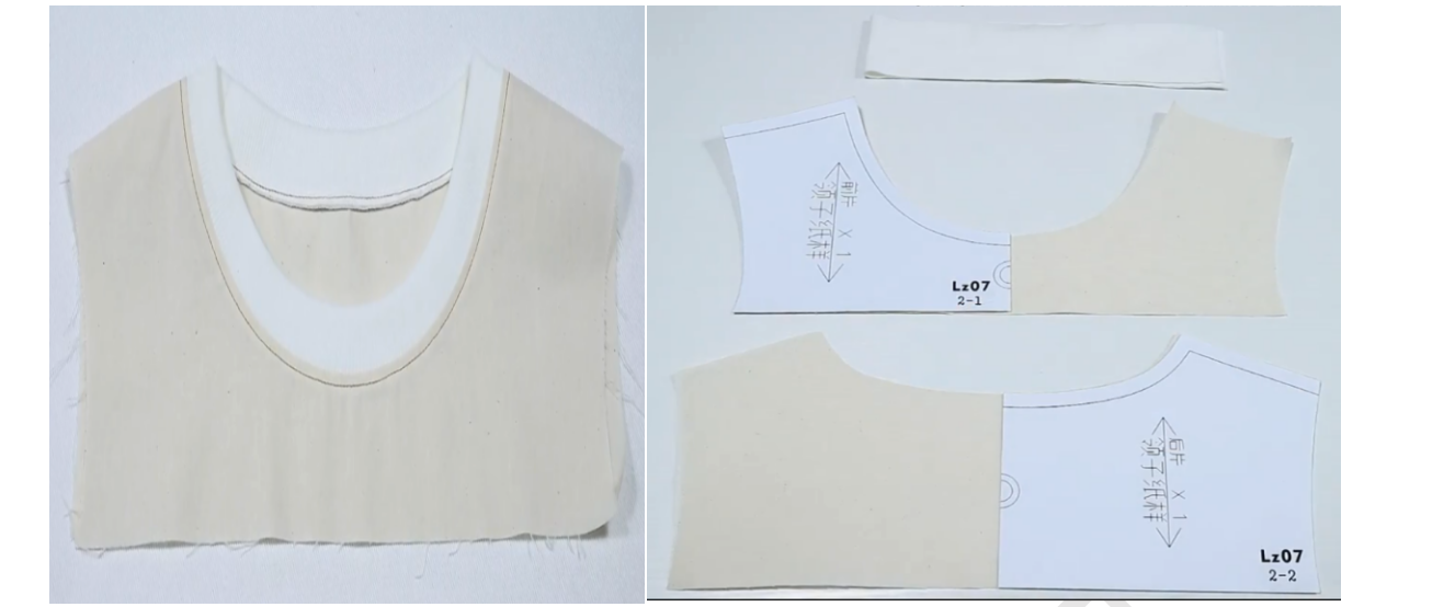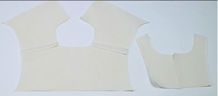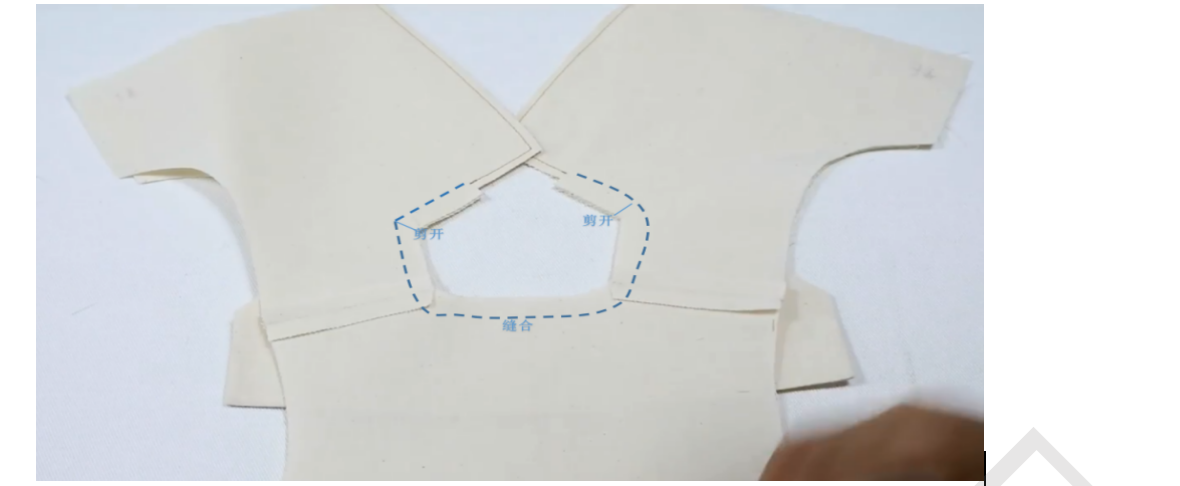 1、前衣片前领贴正正相对,缝合领口,两端距离肩线留1cm不缝,缝合袖笼线,肩线端留5cm不缝。留0.5缝份,打剪口