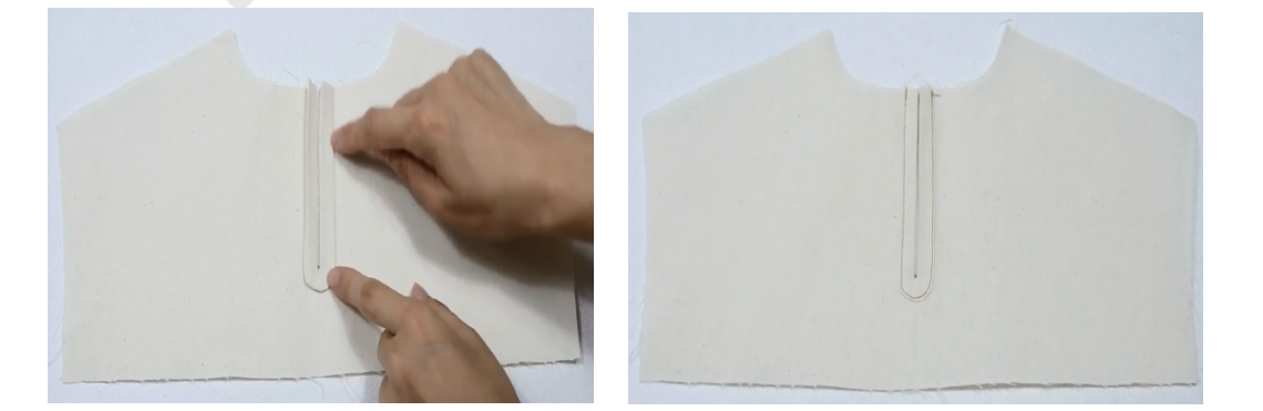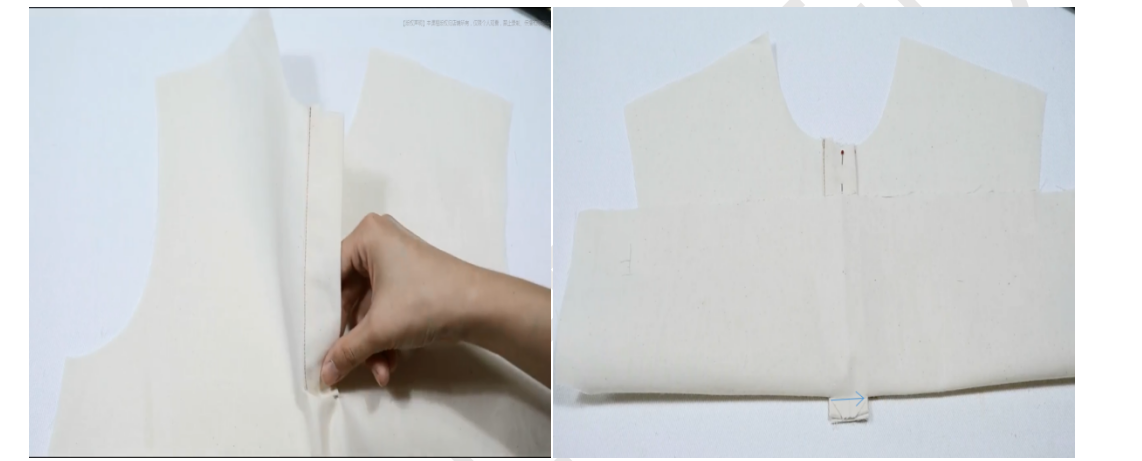 2、处理衣身岔口:衣片后中剪开9cm,向两边拉开,整理平顺,用包边条夹住,压0.1明线,注意包边条中间只需夹住一点,能缝住就可以,最后加固叉口底部
