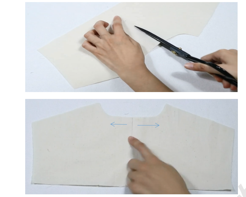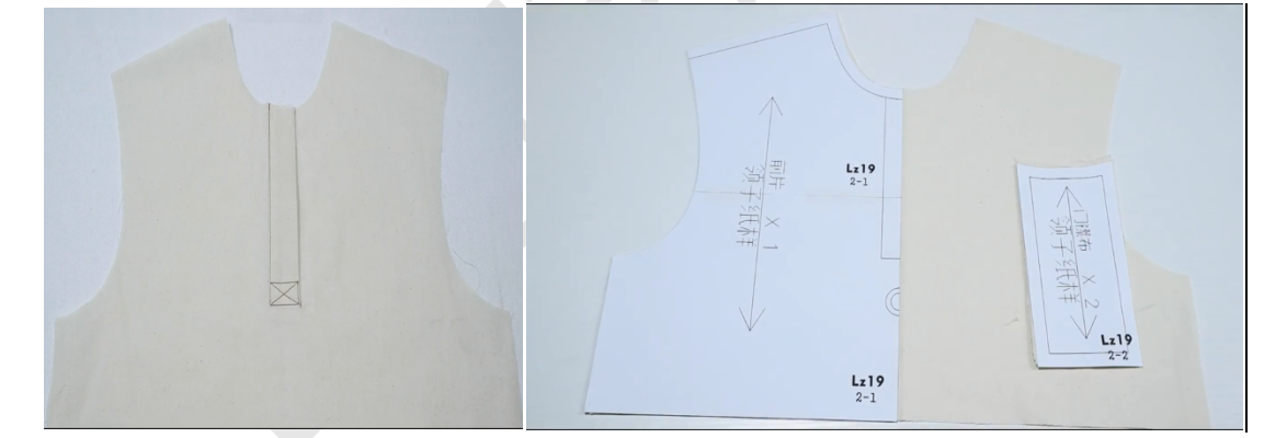 2、布贴衣片正正相对,将布贴中线与衣身后中线对齐,在对齐线两边缝合两条9CM长平行线,并剪开对齐线