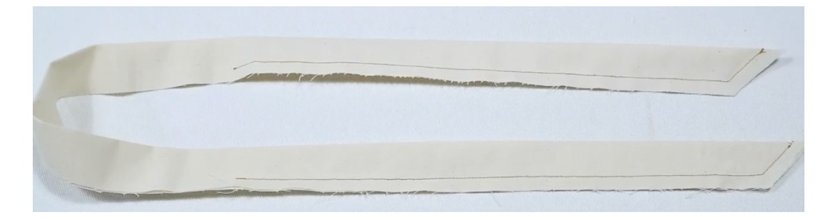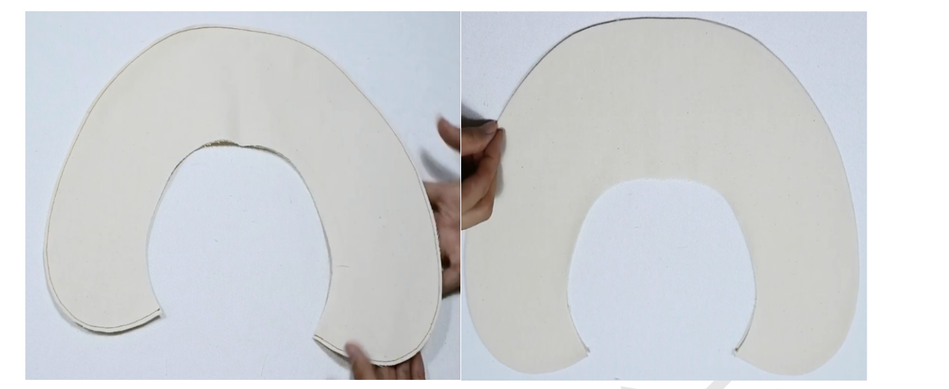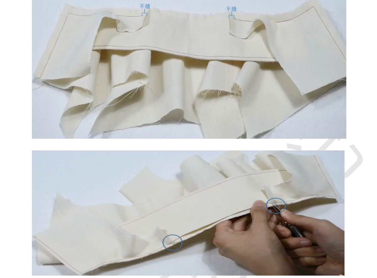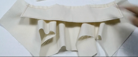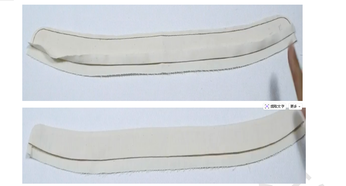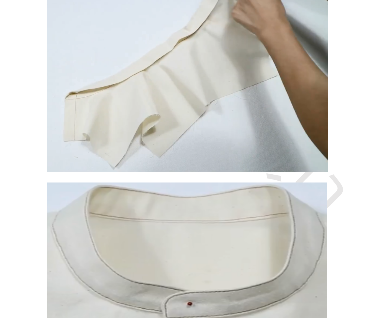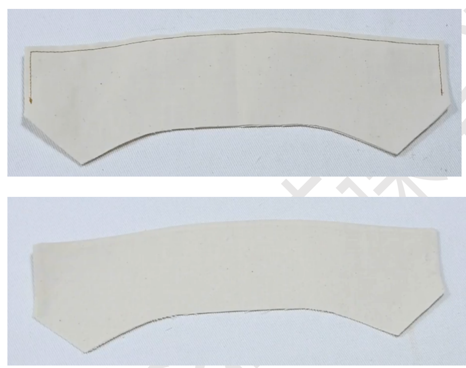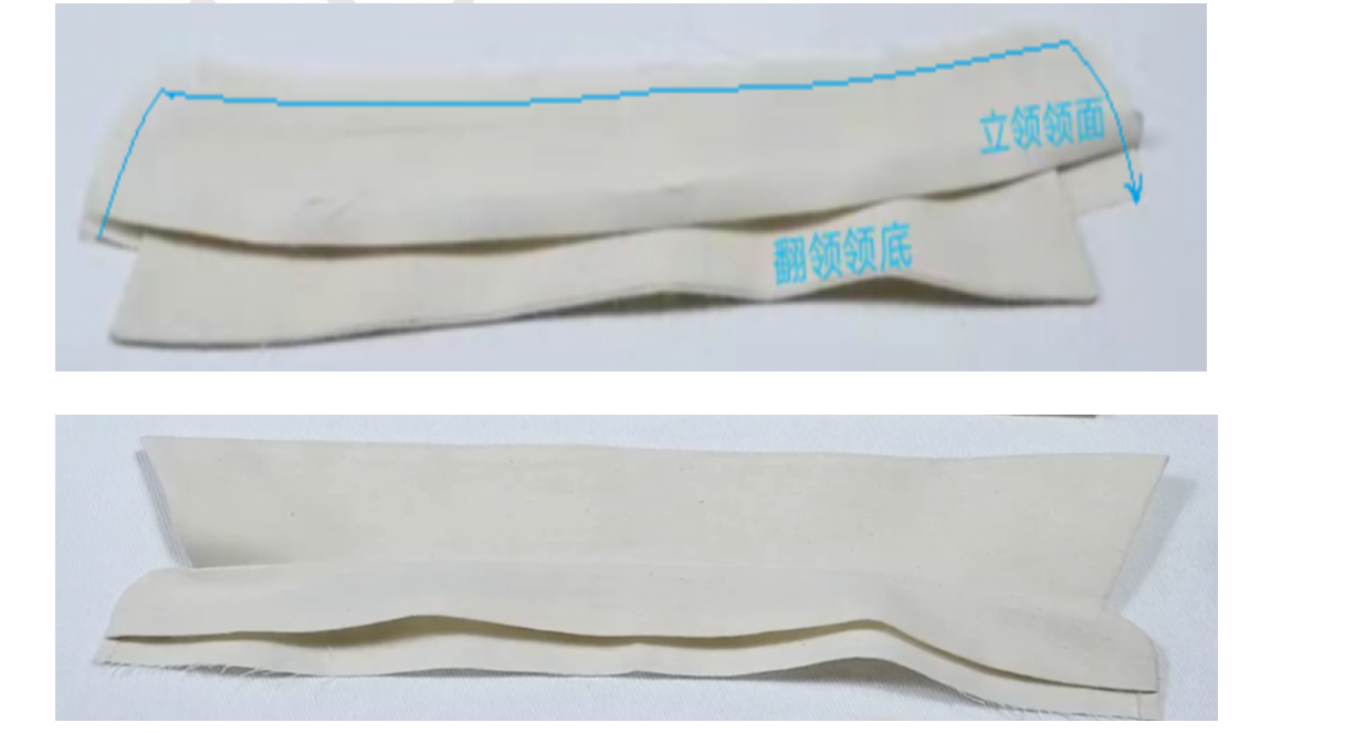 4、两片领子正正相对,缝合上边缘,缝份留0.5,弧度部分0.3,翻面,缝份错0.1,熨烫