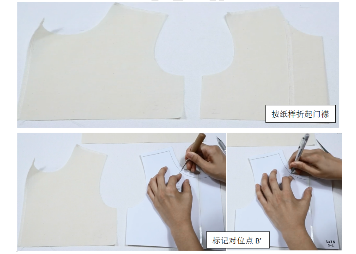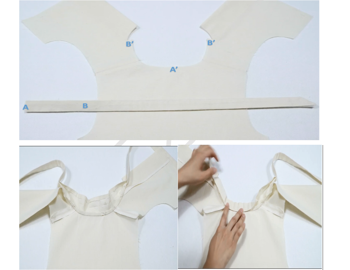 4、上领子,操作同(八)立领,注意对位(领中点A对后领中点A’,领对位点B对门襟对位点B’),压0.2明线(对折线不压)