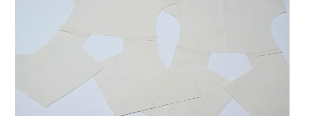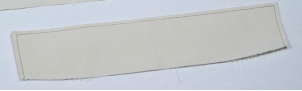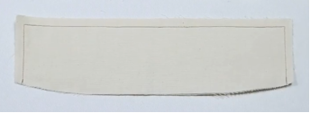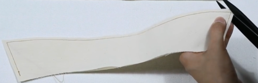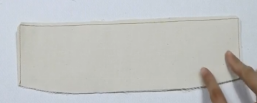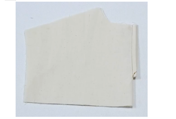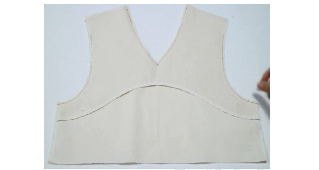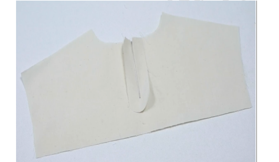1、准备贴边布条:宽4cm,长11cm,底边修成圆弧状(贴边条一般宽4CM。长度根据领叉长度加2cm缝份得到)