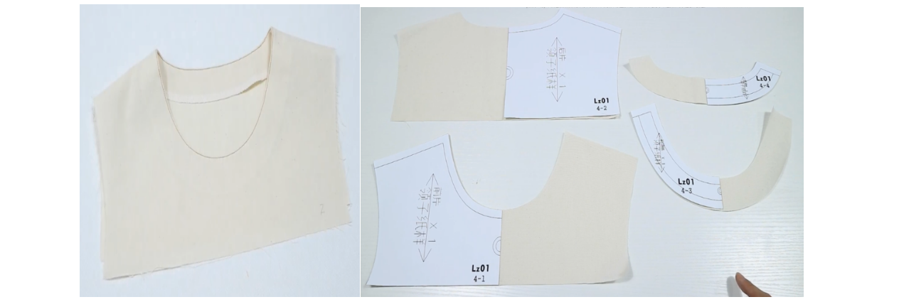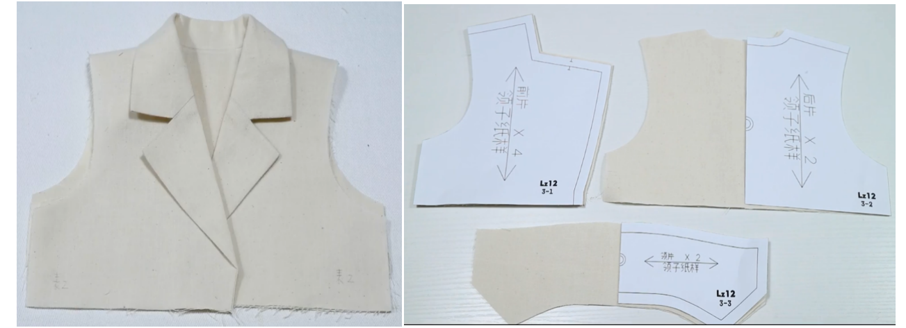 7、上领子:方法2操作较复杂,领的缝份劈烫后较薄。分别将领面和衣身里布缝合,领底和衣身表布缝合,缝份劈烫