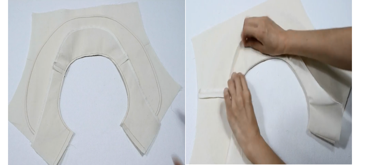 6、缝合立领和翻领,,缝份留0.5,转角0.3,翻面,熨烫