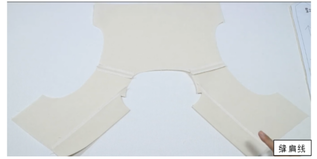 1、裁片→锁边→烫衬→缝合衣身前后片肩线,缝份倒向后片,烫平