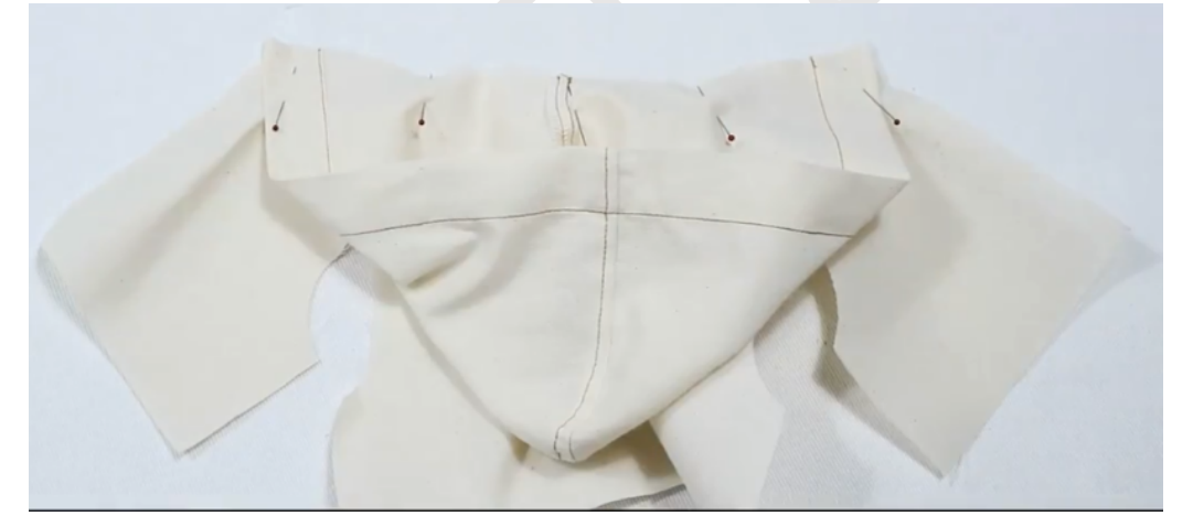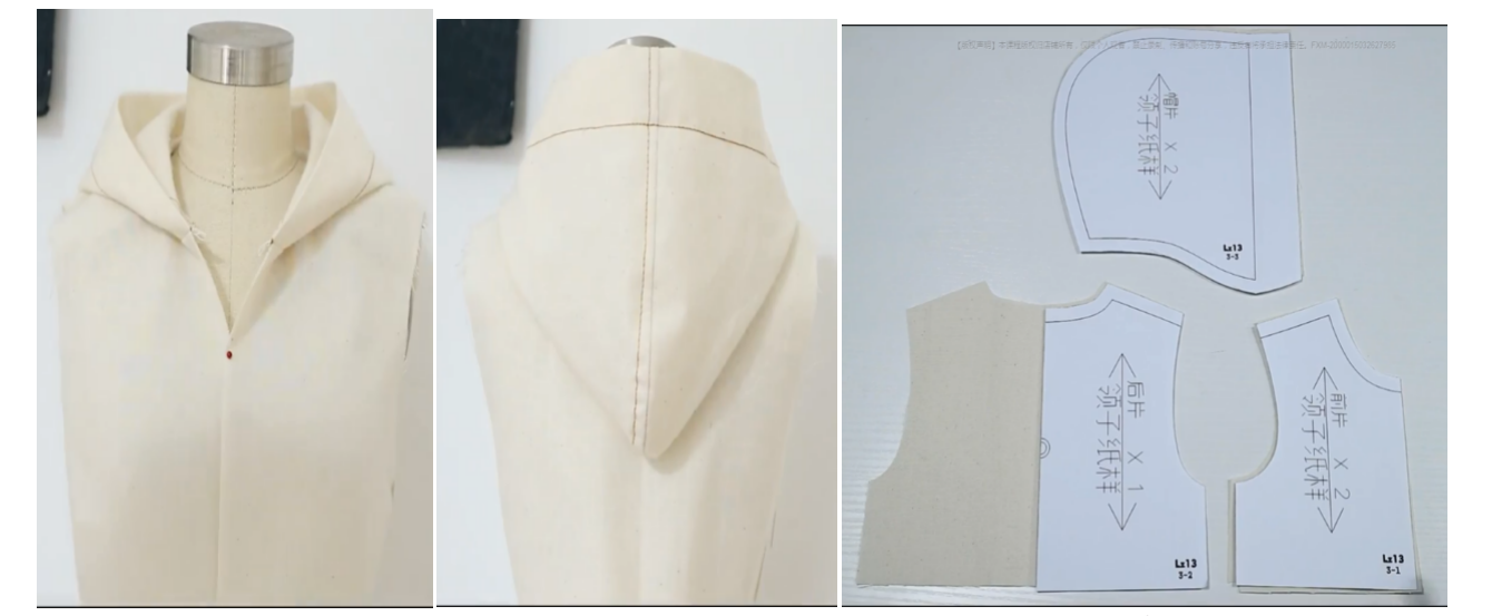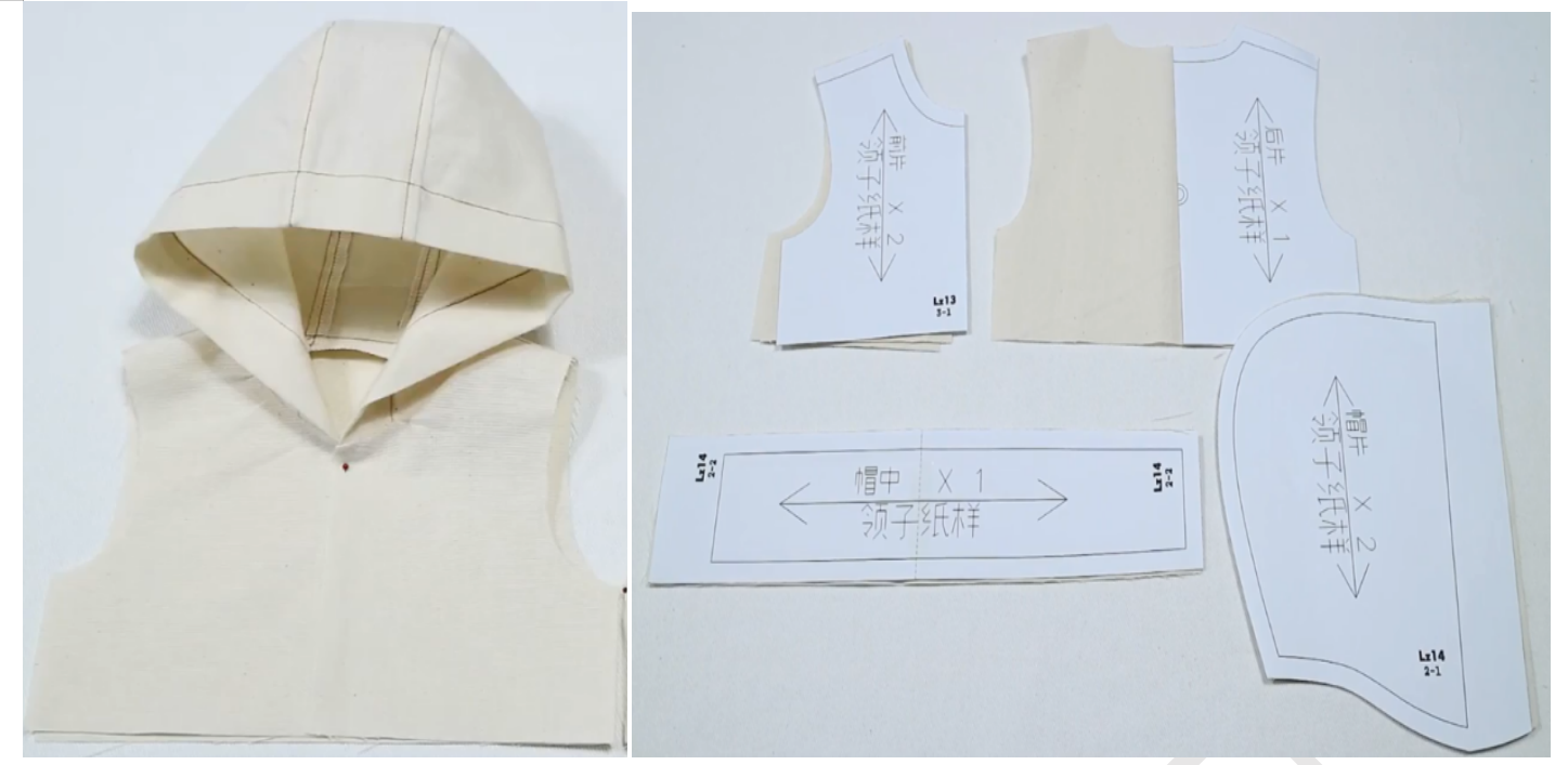 3、上帽子:帽子衣身正正相对缝合领围,注意对位,锁边,同两片式帽领