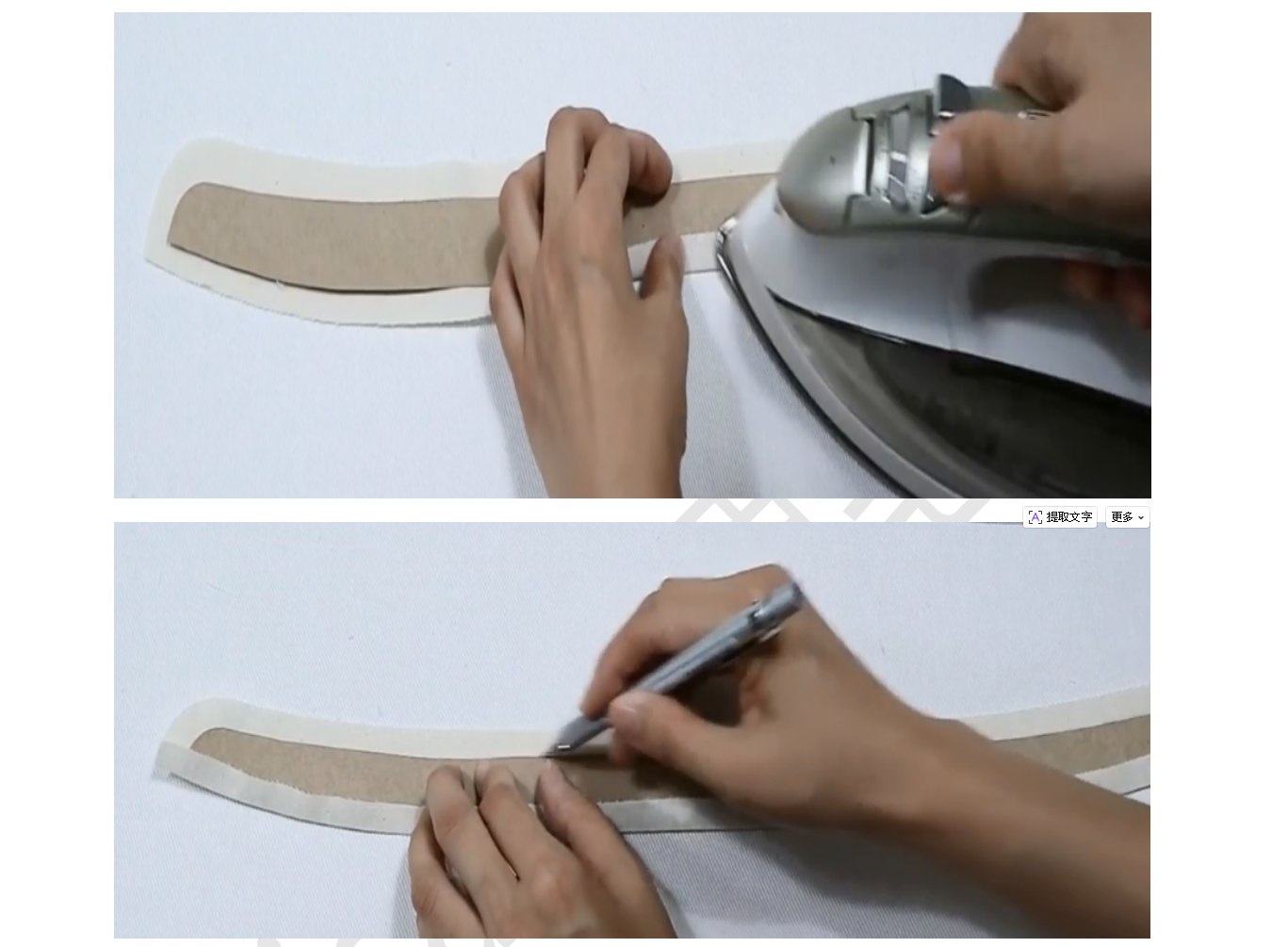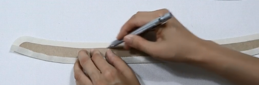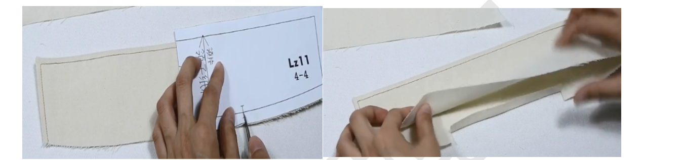 3、领子烫衬:贴近脖子的内层是领底,外层是领面。领面反面烫衬,记号笔画出上沿缝份,下沿缝份内折烫平