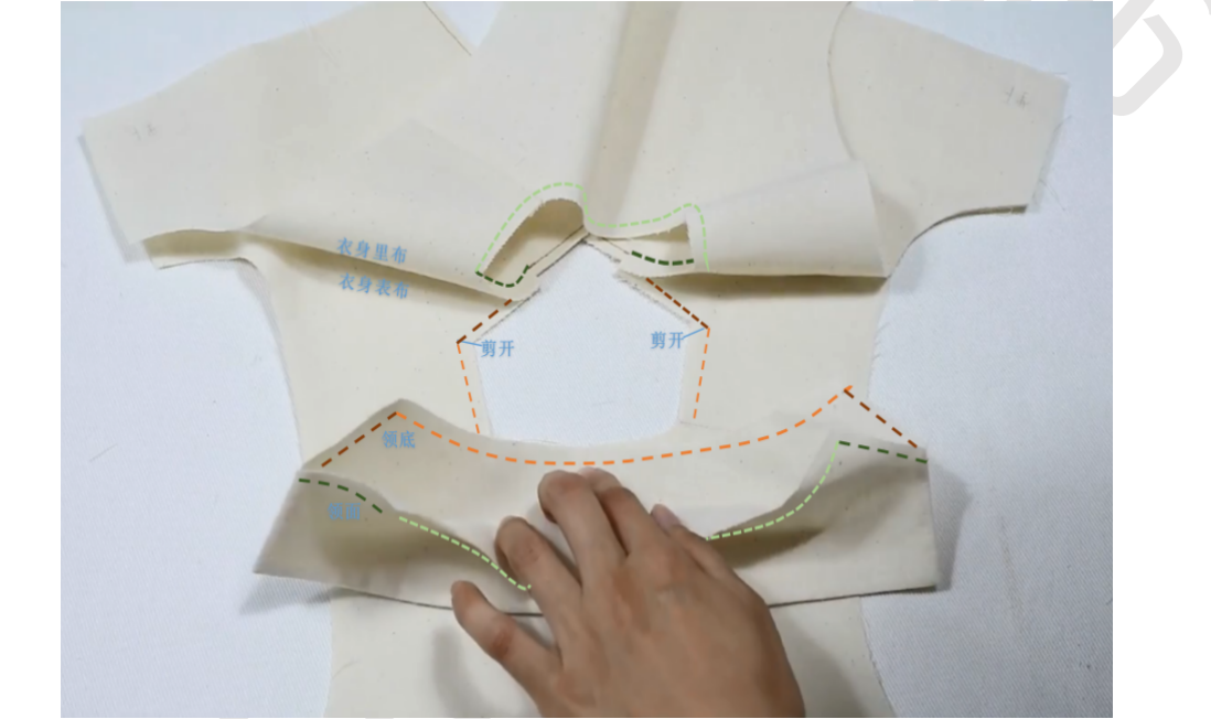 5、领底衣身正反相对。缝合领围,注意两个端点、后领中点对位