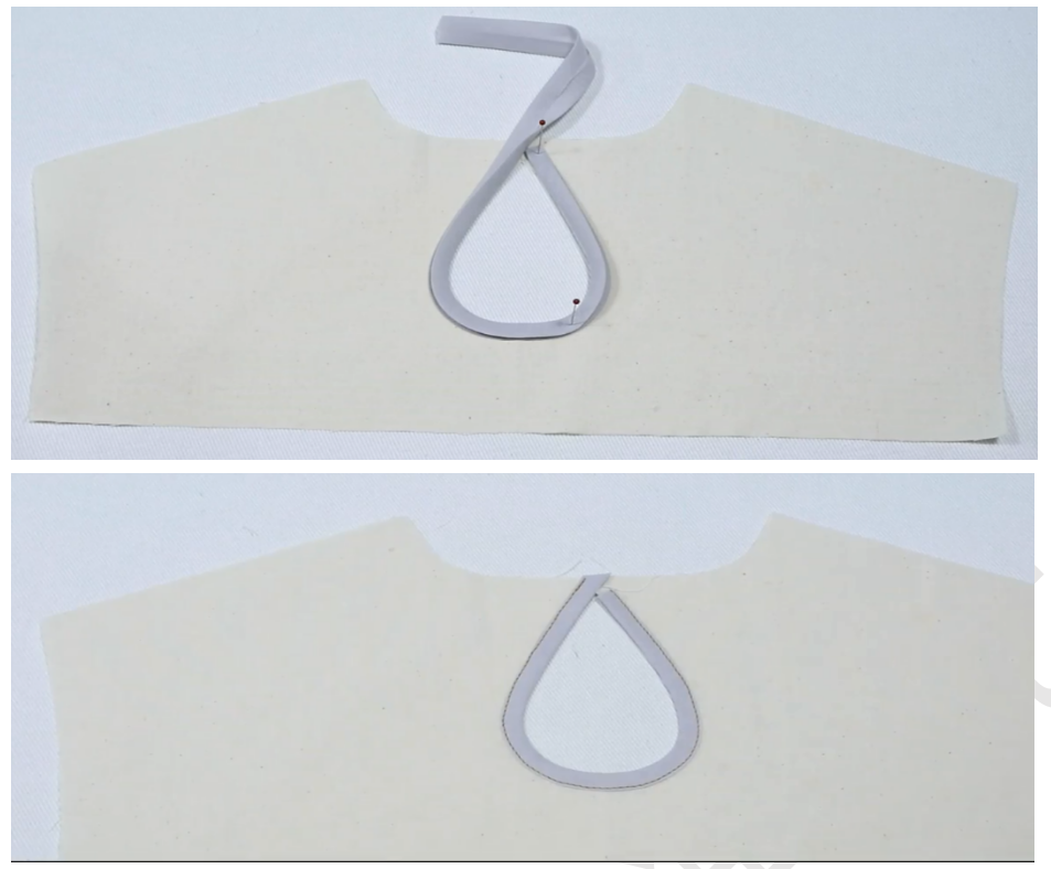 3、确定包边条长度:包边条沿领口假缝一圈,稍拉伸,注意两端各留1cm缝份
