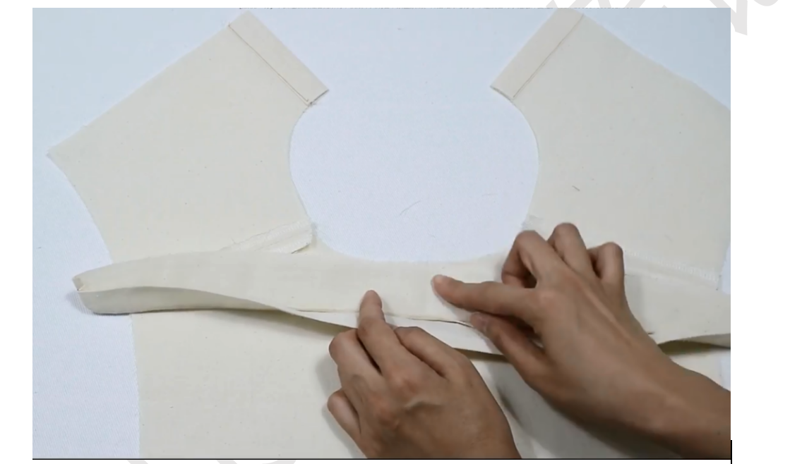 6、包边条夹住衣身领围进行双面夹缝