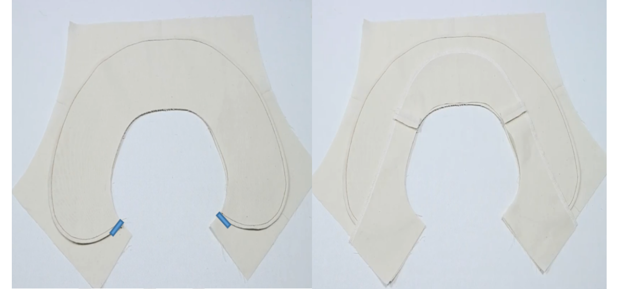 2、衣身、领贴正正相对缝合领围、袖笼,打剪口,留0.5缝份,缝份倒向里布烫平