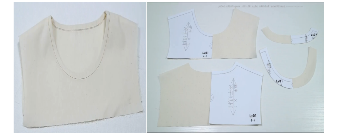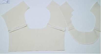 2、翻面,缝份错0.1,整烫。同理处理后衣片和后领贴,前后片正正相对,缝合表布肩线,劈缝