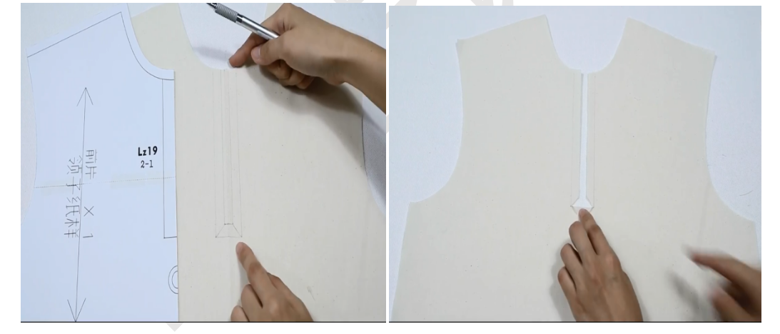 1、衣身前片画出前领岔(长15,宽3),并裁剪